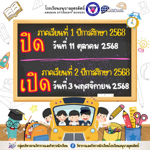 แจ้งวันปิดเรียนภาคเรียนที่ 1 และเปิดเรียนภาคเรียนที่ 2 ปีการศึกษา 2568 08 ต.ค. 68