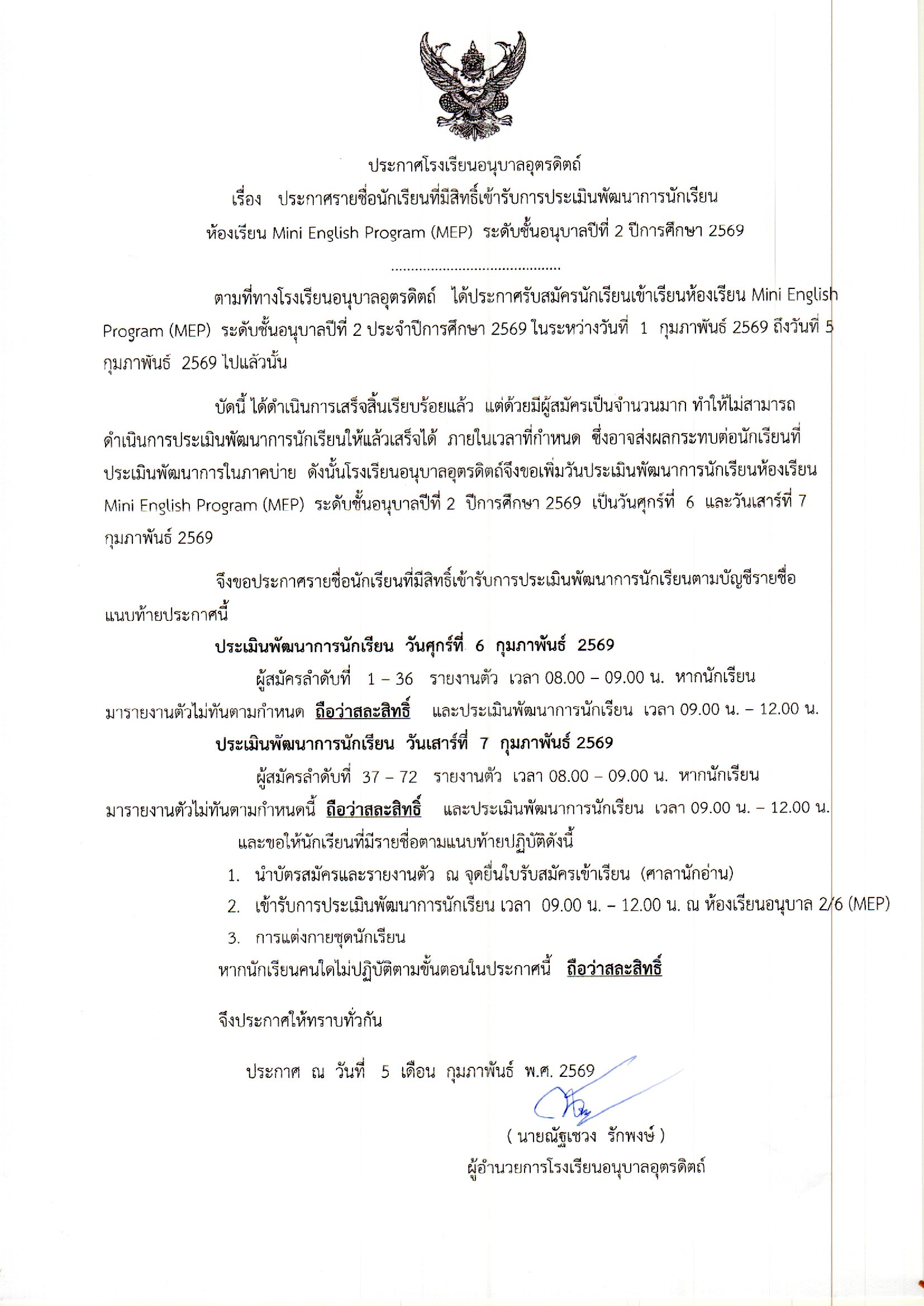ประกาศรายชื่อนักเรียนที่มีสิทธิ์เข้ารับการประเมินพัฒนาการนักเรียน ห้องเรียน Mini English Program (MEP) ระดับชั้นอนุบาลปีที่ 2 ปีการศึกษา 2569
