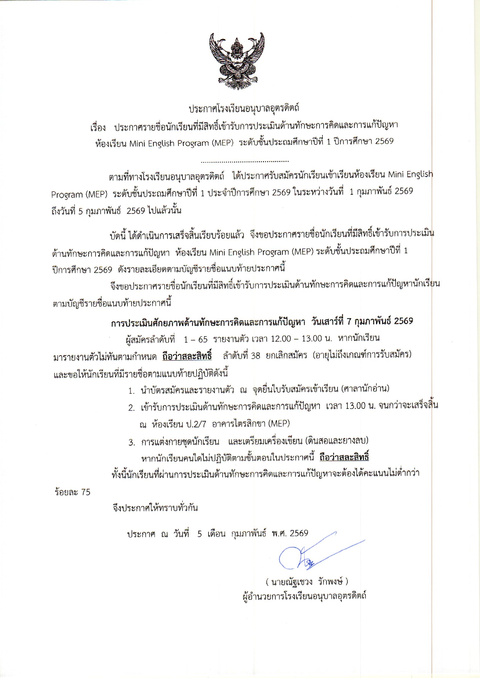 ประกาศรายชื่อนักเรียนที่มีสิทธิ์เข้ารับการประเมินด้านทักษะการคิดและการแก้ปัญหา ห้องเรียน Mini English Program (MEP) ระดับชั้นประถมศึกษาปีที่ 1 ปีการศึกษา 2569