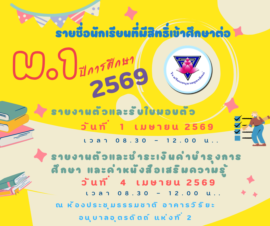 1. รายงานตัวและรับใบมอบตัว วันที่ 1 เมษายน 2569 เวลา 08.30 – 12.00 น. ห้องประชุมธรรมชาติ อาคารวิริยะ โรงเรียนอนุบาลอุตรดิตถ์ แห่งที่ 2
